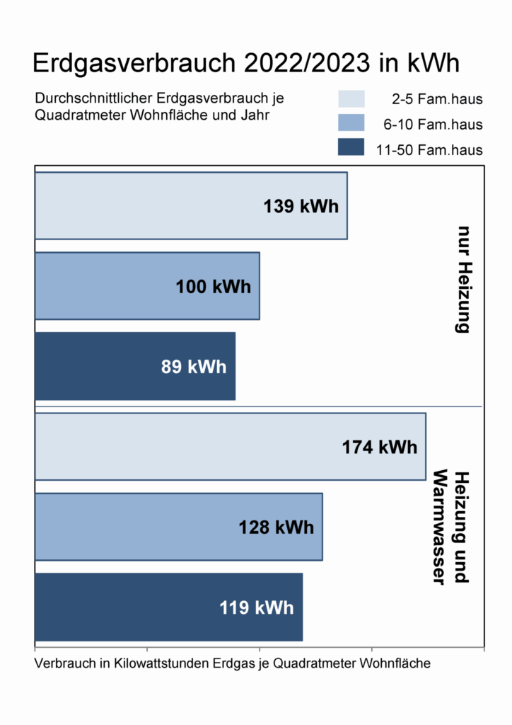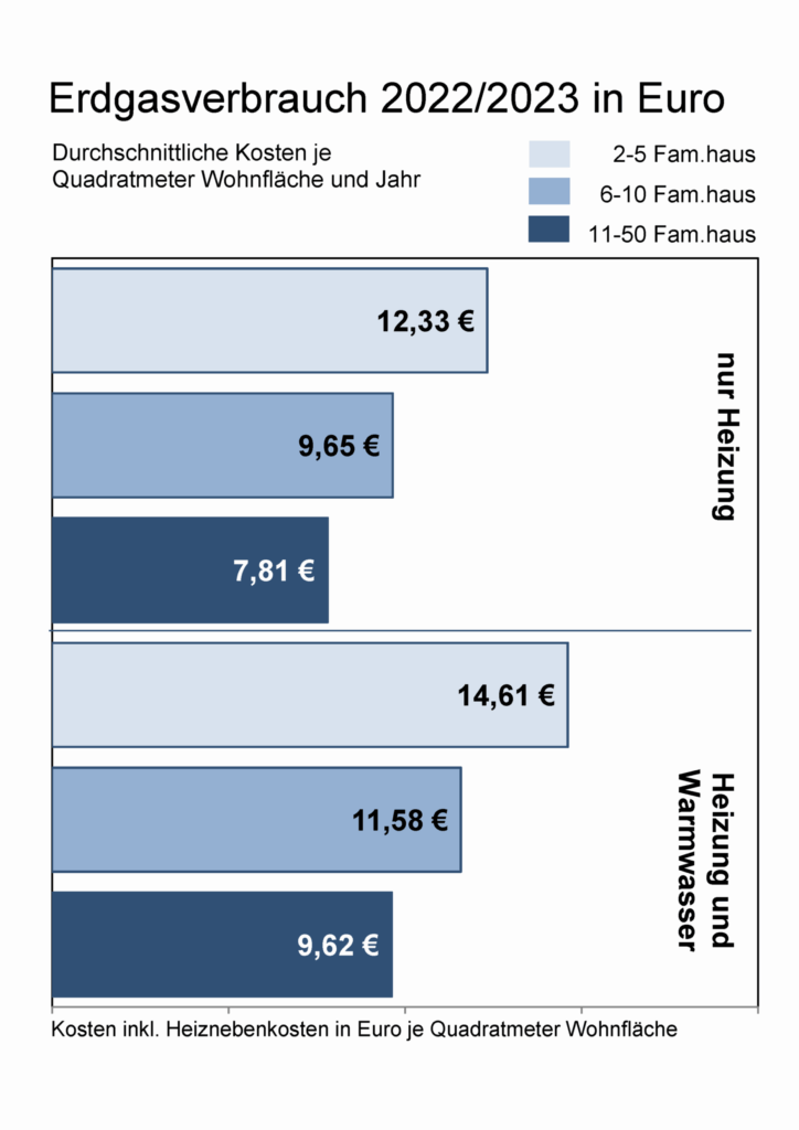 Bildunterschrift: Die Grafik zeigt den Verbrauch und die Kosten bei Erdgas für Häuser verschiedener Größen im Abrechnungsjahr 2022/23. Quelle: Minol