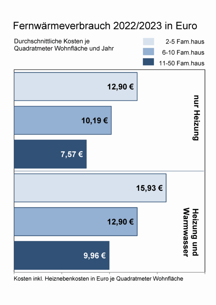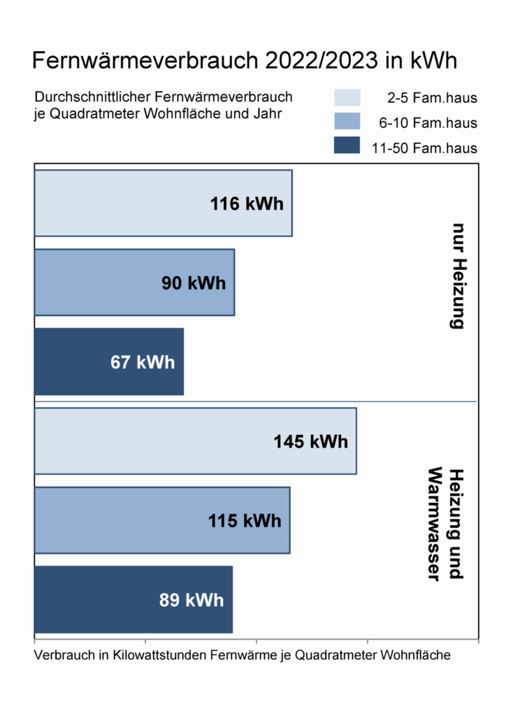 Bildunterschrift: Die Grafik zeigt den Verbrauch und die Kosten bei Fernwärme für Häuser verschiedener Größen im Abrechnungsjahr 2022/23. Quelle: Minol