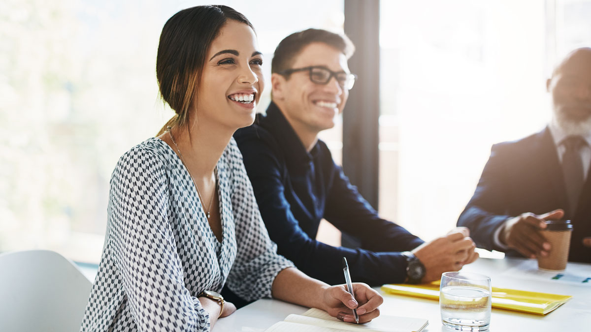 Drei Personen schauen auf einen Bildschirm an einem Schreibtisch. Die Frau zeigt auf etwas mit ihrer Hand.